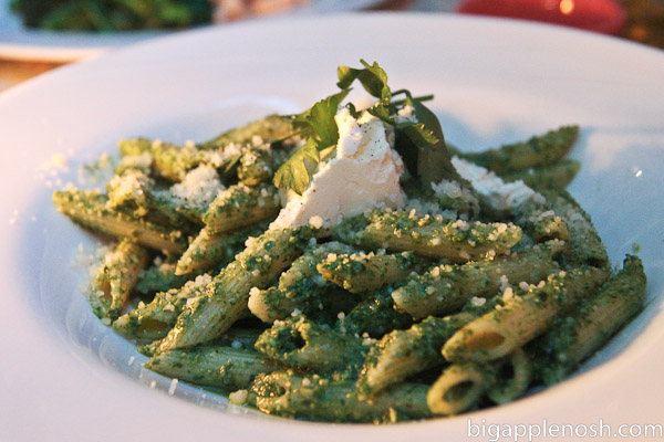 I ordered the pasta special – pesto penne topped with a soft cheese, the name of which escapes me now (but was deeeelicioso!). I am a HUGE pesto fan. Huge. This one was exploding with fresh basil flavor – so yummy! The soft cheese added creaminess and just a touch of tang to the dish. Anyone know what type of cheese this is? All I know is that I was wiping up these pesto sauce with the breadbasket. Mmm!