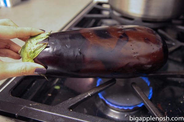 2. Prick each eggplant a few times, then char the outside of the eggplants by placing them directly on the flame of a gas burner and as the skin chars, turn them until the eggplants are uniformly-charred on the outside.