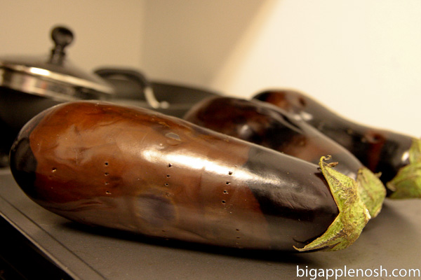 3. Place the eggplants on a baking sheet and roast in the oven for 20 to 30 minutes, until they’re completely soft; you should be able to easily poke a paring knife into them and meet no resistance. Remove from oven and let cool.